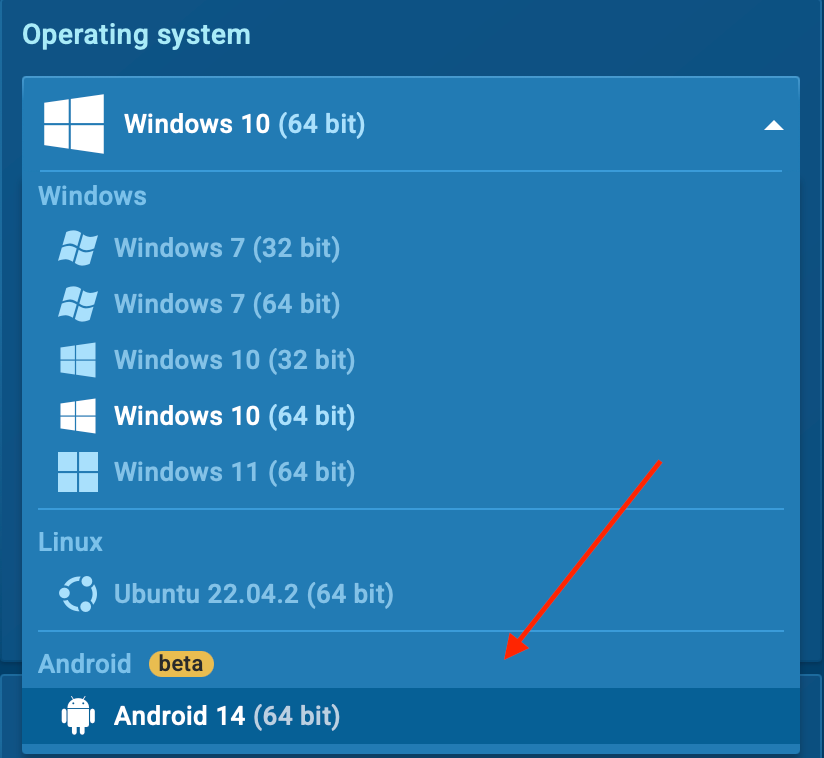 Select Android OS – Before launching an analysis, choose Android from the operating system menu.