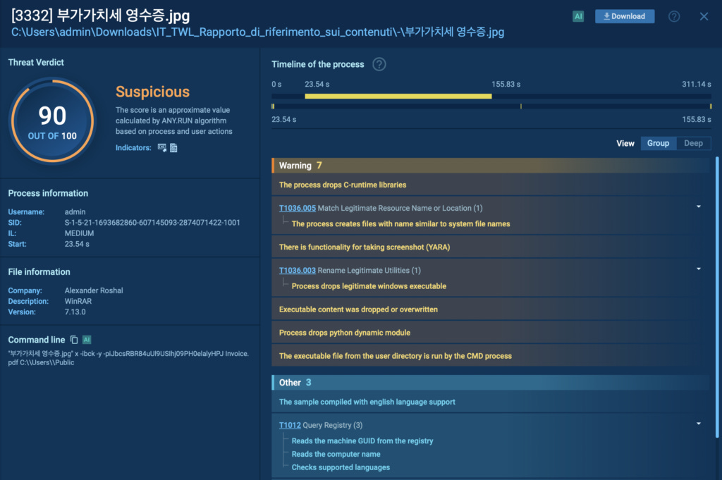 The attack continues as a renamed instance of WinRAR, disguised as a JPEG image (부가가치세 영수증.jpg), unpacks the archive using the password