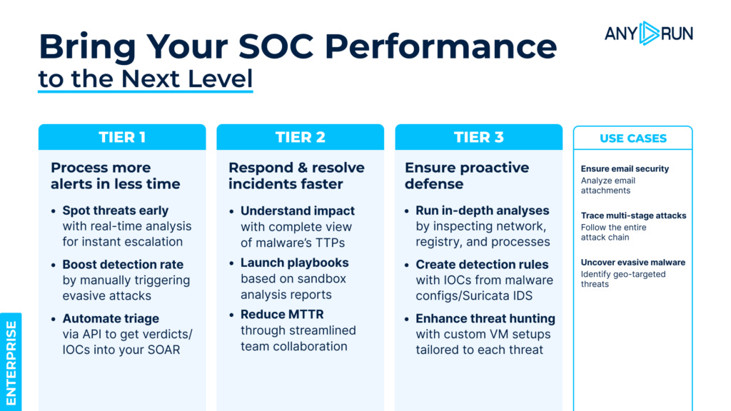 ANY.RUN is a leading provider of interactive malware analysis and threat intelligence solutions, built to give SOC teams the visibility they need when traditional tools fall short.